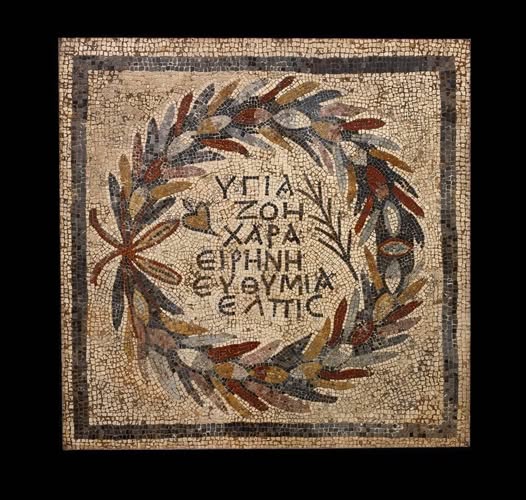 Ὑγίεια, ζωή, χαρά, εἰρήνη, εὐθυμία, ἐλπίς ! Santé, vie, joie, paix, bonne humeur et espoir! mosaïque du IVème siècle qui provient de la région de …